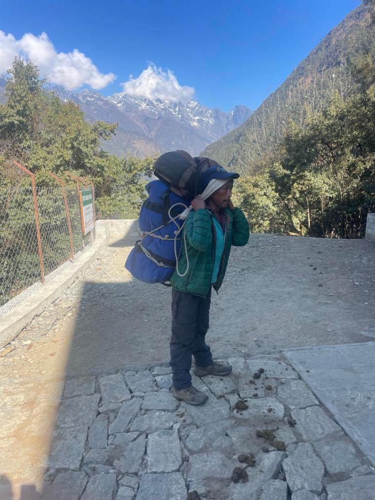 After being quickly ferried through the ‘airport’ (a small pink room), we were introduced to our local porter, who stood a mere 5’5 or so tall and would have been lucky to have weighed 60kg. He didn’t speak a word of English, but he had a smile that told us he was happy to be on his first hike of the season. I felt a little guilty about this man carrying our bags all the way up and down the mountain for us. He would carry both bags as well as his own gear, all amounting to 25-30kg. As you can see from the picture, the Nepalese have discovered that transferring the weight through the head makes it much easier to carry and means they can carry ludicrous weights on there back. For me, it just didn’t feel right, knowing that I could carry my 15kg or so up the mountain. But, Laxman assured as that we had done the right thing, for this is how the porter survived and supported his family.